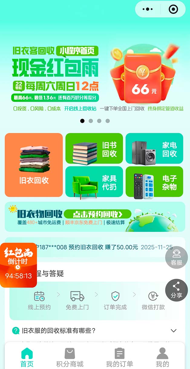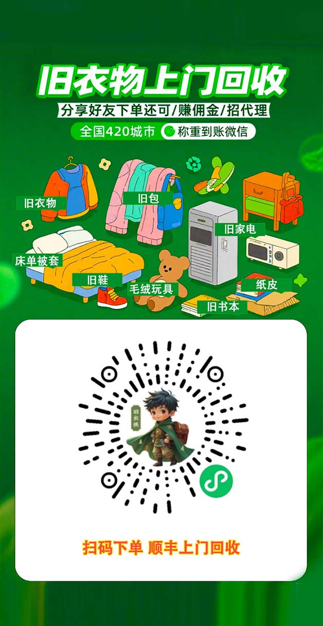 线上旧衣回收,小程序下单,顺丰上门回收还包邮! 免费上门高价回收旧衣服,旧鞋,旧包,旧家电,旧书本。